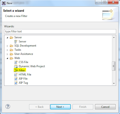 FilterChain is an interface used to invoke the next filter in the chain. Create a Filter in your web project right click on the project and select others, in that select Filter.