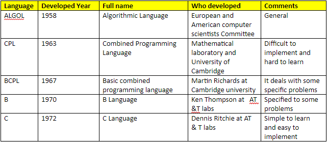 C was so popular because it is reliable, simple and easy to use . Basic Combined programming Language (BCPL), Developed by Martin Richards at Cambridge university aimed to solve this problem by bringing CPL down to its basic good features . But unfortunately it turned out to be too less powerful and too specific. Around same time a language called B was written by Ken Thompson at AT&T’s Bell Labs, as a further simplification of CPL. But like BCPL, B too turned out to be very specific.